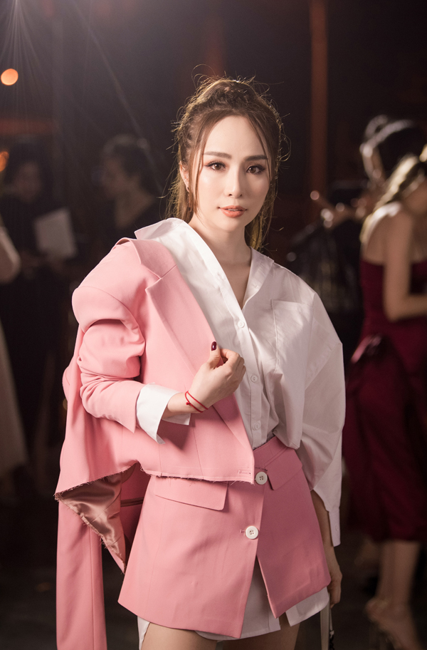 Show thời trang còn thu hút nhiều ngôi sao trên thảm đỏ như ca sĩ Quỳnh Nga. Cô chọn bộ cánh phá cách với tone trắng - hồng. Đây là lần đầu tiên Quỳnh Nga lộ diện sau nghi vấn đã ly hôn người mẫu Doãn Tuấn.