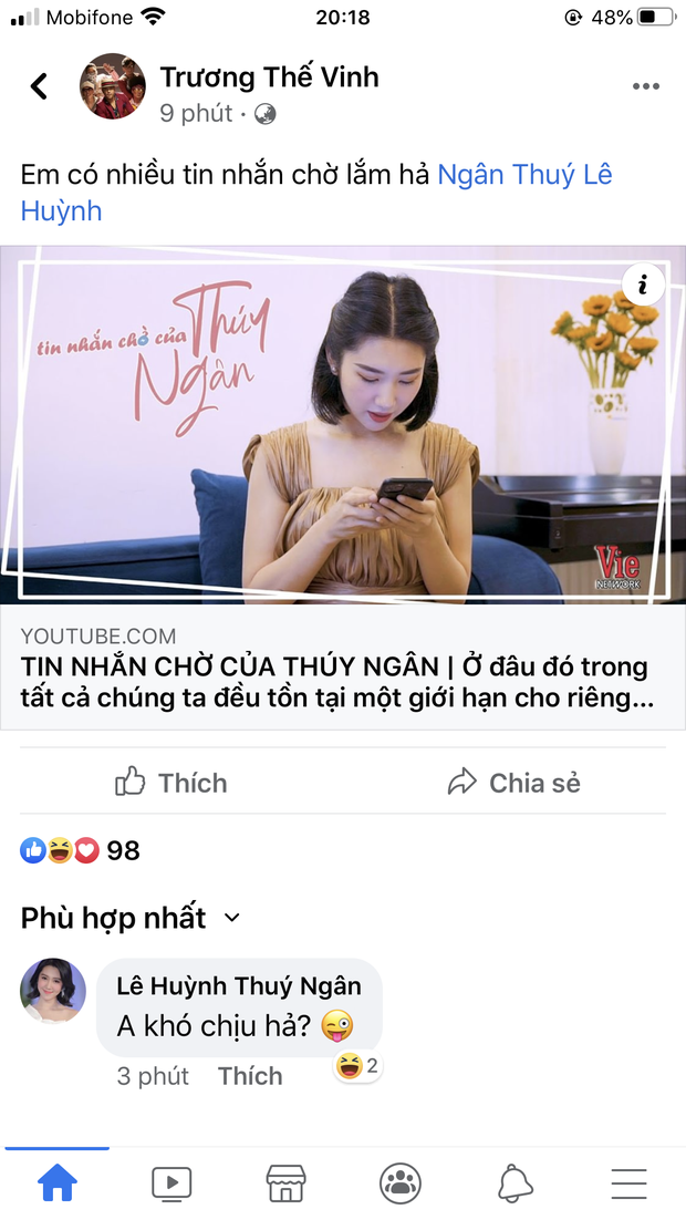 Mới đây nhất, Trương Thế Vinh còn để lộ động thái cho thấy cả hai "tình trong như đã, mặt ngoài còn e". Chuyện là trong vlog, Thúy Ngân kể về ngày xưa người yêu cũ từng đập điện thoại mình nhiều lần vì nhìn thấy tin nhắn chờ của những chàng muốn cưa cẩm cô. Nay nghe được, Trương Thế Vinh liền công khai tag bạn gái tin đồn vào bài đăng mới nhất để chất vấn: "Em có nhiều tin nhắn chờ lắm hả".
