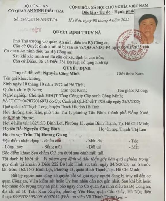 Căn cứ kết quả điều tra, ngày 6/3/2025 Cơ quan An ninh điều tra, Bộ Công an đã ra Quyết định khởi tố bị can số 78/QĐ-ANĐT-P4, đồng thời ngày 8/4/2025 ra Quyết định truy nã số 534/QĐTN-ANĐT-P4 đối với: Nguyễn Công Minh; sinh ngày 10/10/1972 tại Hà Tĩnh; nghề nghiệp: Chủ tịch Hội đồng quản trị Tổng Công ty Cây xanh Công Minh; Số CCCD: 042072016973 do Cục Cảnh sát QLHC về TTXH Bộ Công an cấp ngày 25/3/2022; Nơi thường trú: Khu phố Tân Trà 1, phường Tân Bình, thành phố Đồng Xoài, tỉnh Bình Phước (nay thuộc phường Bình Phước, tỉnh Đồng Nai).