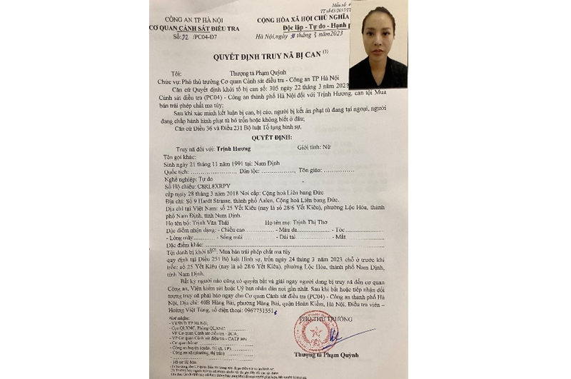 Căn cứ vào tài liệu điều tra, ngày 22/3/2023, Cơ quan CSĐT Công an Thành phố Hà Nội đã ra quyết định khởi bị can đối với Trịnh Hương về tội Mua bán trái phép chất ma túy. Tuy nhiên, đối tượng đã bỏ trốn, hiện không rõ tung tích ở đâu. Ngày 30/3/2023, Cơ quan CSĐT Công an thành phố Hà Nội đã ra quyết định truy nã bị can đối với Trịnh Hương.