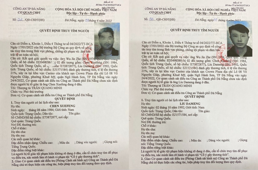Cụ thể, Cơ quan Công an TP Đà Nẵng ra quyết định truy tìm đối với Chen Xuefeng (1984, quốc tịch Trung Quốc, số hộ chiếu E73872877) và Liu Dameng (1992, quốc tịch Trung Quốc, số hộ chiếu EJ1571584) để phục vụ điều tra, xác minh làm rõ hành vi “Cố ý gây thương tích”.