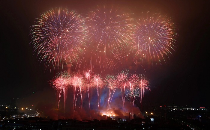 Pháo hoa bùng nổ trên SVĐ Quốc gia Mỹ Đình. Trong 2 tiếng của chương trình, cảnh quan đầy màu sắc do công nghệ tạo ra kết hợp với những màn biểu diễn nghệ thuật truyền thống".
