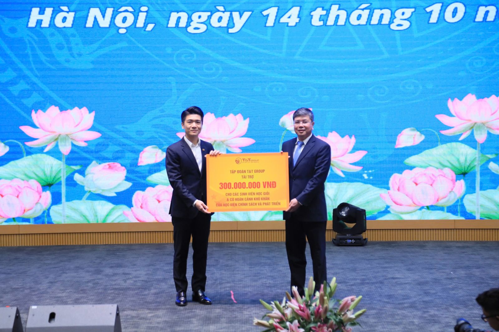 Trước đó, trong năm học 2023-2024, T&T Group cũng đã trao 20 suất học bổng với tổng trị giá 200 triệu nhằm tiếp sức các em sinh viên học giỏi và có hoàn cảnh khó khăn của Học viện Chính sách và phát triển theo đuổi đam mê, chinh phục ước mơ. Bên cạnh đó, Tập đoàn cũng đã tài trợ cho Học viện các dụng cụ, trang thiết bị của các môn thể thao như: bóng rổ, bóng bàn, cầu lông,… với tổng trị giá 200 triệu đồng, góp phần hoàn thiện hệ thống cơ sở vật chất, tạo không gian sinh hoạt cộng đồng, văn hóa, thể thao hiện đại, giúp các em sinh viên phát triển toàn diện về trí tuệ - tinh thần - thể chất.