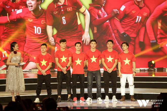 Tiếp đó, sự xuất hiện trên sân khấu Gala Wechoice là thủ môn Bùi Tiến Dũng và các cầu thủ Bùi Tiến Dũng, Nguyễn Công Phượng, Nguyễn Quang Hải, Xuân Mạnh, Duy Mạnh - đại diện đội tuyển U23 Việt Nam, đã khiến những người có mặt tại lễ trao giải cực kỳ phấn khích.