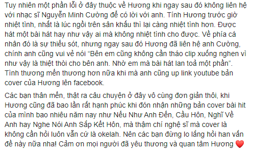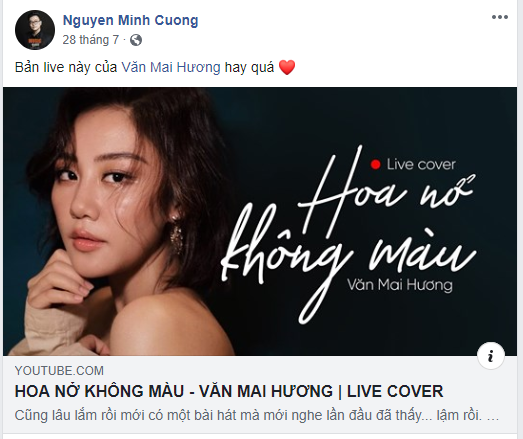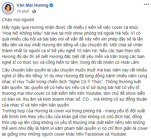 Mới đây, trên trang cá nhân chính thức của mình, nữ ca sĩ Văn Mai Hương đã đăng tải một bức thư khá dài chia sẻ về việc cô đã cover ca khúc ‘Hoa Nở Không Màu’ của nhạc sĩ Nguyễn Minh Cường mà chưa có được sự cho phép.