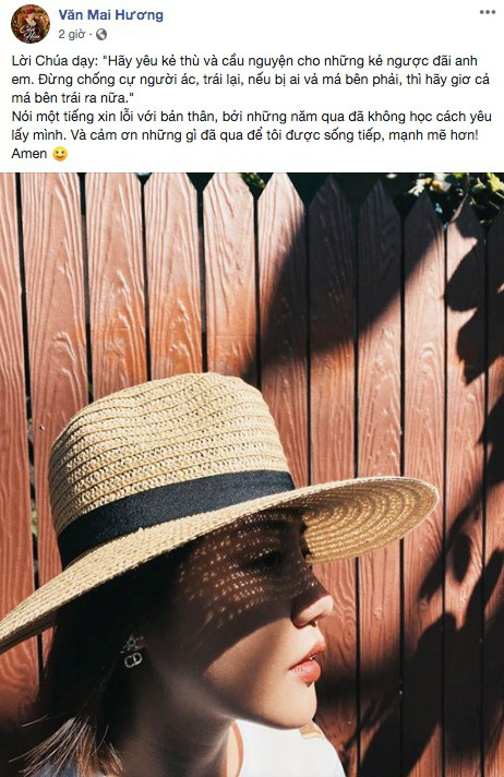 Trước đó, sau 10 ngày xảy sự cố, cô từng đăng tải bức kèm theo dòng trạng thái: "Lời Chúa dạy: 'Hãy yêu kẻ thù và cầu nguyện cho những kẻ ngược đãi anh em. Ðừng chống cự người ác, trái lại, nếu bị ai vả má bên phải, thì hãy giơ cả má bên trái ra nữa'. Nói một tiếng xin lỗi với bản thân, bởi những năm qua đã không học cách yêu lấy mình. Và cảm ơn những gì đã qua để tôi được sống tiếp, mạnh mẽ hơn".