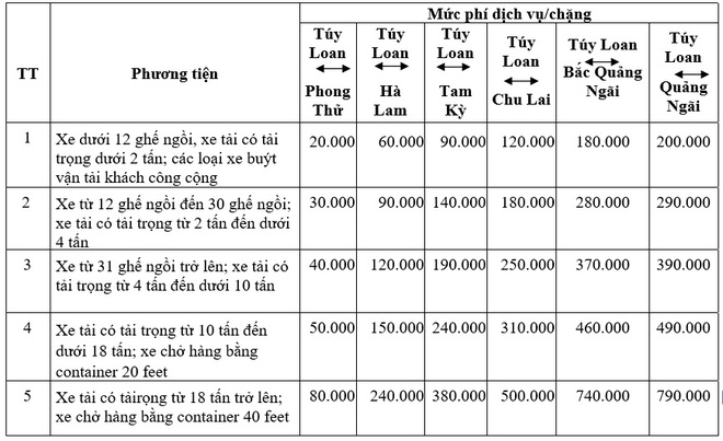 Theo biểu phí được Tổng công ty Đầu tư phát triển Đường cao tốc (VEC) công bố, mức phí để di chuyển toàn tuyến từ Túy Loan đến Quảng Ngãi thấp nhất là 200.000 đồng (xe dưới 12 chỗ) và cao nhất là 790.000 đồng (xe từ 18 tấn trở lên).