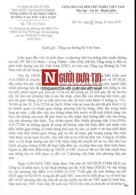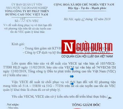 Văn bản số 336 nêu rõ: “Đối với đề xuất của VEC E từ chối phục vụ 2 phương tiện nêu trên là chưa đủ cơ sở pháp lý, VEC sẽ rà soát lại các quy định, quy trình nội bộ cho phù hợp với các quy định của pháp luật”.