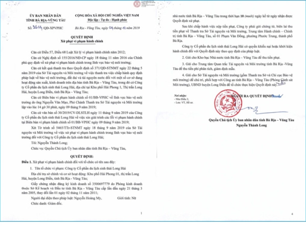 Ngày 4/10/2019, UBND tỉnh Bà Rịa – Vũng Tàu đã ban hành Quyết định Xử phạt vi phạm hành chính số 2614/QĐ – XPVPHC đối với Công ty cổ phần du lịch sinh thái Long Hải căn cứ theo kết quả thanh tra của Sở Tài nguyên và Môi trường tại Quyết định số 371/QĐ – STNMT về việc chấp hành quy định về pháp luật bảo vệ môi trường, đất đai và tài nguyên nước, căn cứ vào Biên bản vi phạm hành số 01/BB – VPHC về lĩnh vực bảo vệ môi trường.