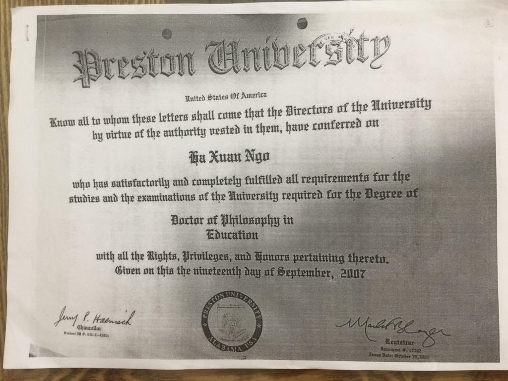 Ông Ngô Xuân Hà, bí thư chi bộ Đảng, hiệu trưởng Trường Đại học Thành Đô được Trường đại học Preston (bang California, Mỹ) cấp bằng tiến sĩ ngày 19/9/2007. Đáng chú ý, Trường đại học Preston không nằm trong danh sách các cơ sở giáo dục đại học được công nhận của Mỹ và Việt Nam. Không chỉ ông Ngô Xuân Hà, bà Ngô Thị Kim Dung (chị ruột ông Hà), hiện đang giữ chức Phó Hiệu trưởng Trường đại học Thành Đô cũng sử dụng bằng tiến sĩ do Trường đại học Preston cấp.