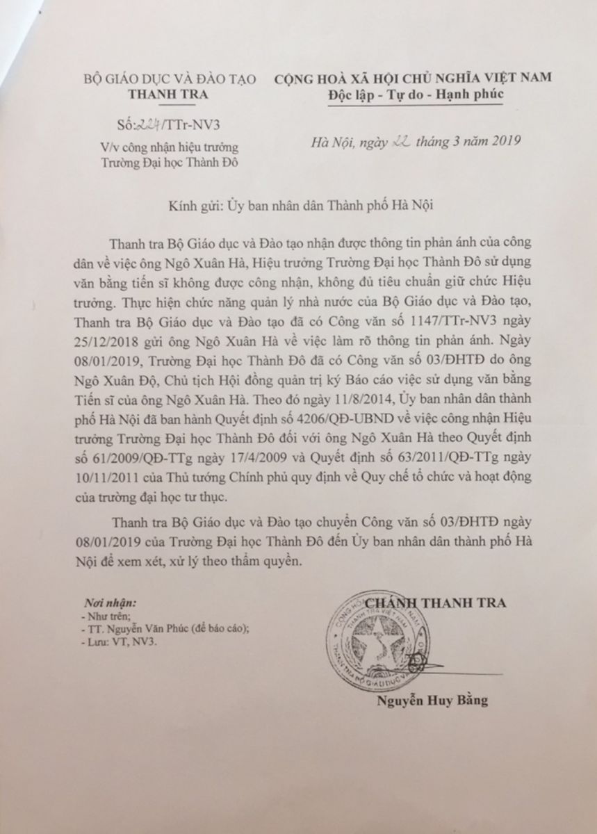 Bên cạnh đó, ngày 9/5/2019, Thanh tra Bộ Giáo dục và Đào tạo có công văn số 406/TTr-NV3 cho biết, ngày 22/3/2019, Chánh Thanh tra Bộ đã gửi công văn số 224/TTr-NV3 đề nghị Ủy ban nhân dân thành phố xem xét, xử lý thông tin phản ánh về việc ông Ngô Xuân Hà, Hiệu trưởng trường Đại học Thành Đô sử dụng văn bằng tiến sỹ không được công nhận, không đủ tiêu chuẩn giữ chức Hiệu trưởng. Tuy nhiên đến nay đã hơn 2 tháng trôi qua, không có thông tin phản hồi nào từ UBND thành phố Hà Nội, mọi việc dường như chìm vào im lặng khó hiểu!