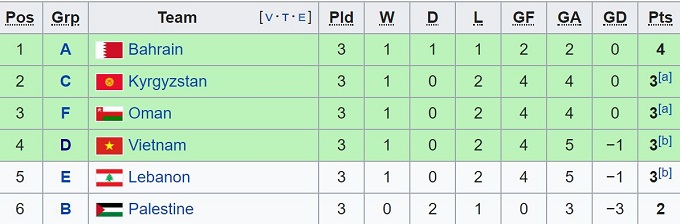 Theo đó, ở bảng E, Lebanon đã đánh bại Triều Tiên với tỉ số 4-1, kết quả giúp Lebanon có cùng 3 điểm như Việt Nam, cùng hiệu số bàn thắng bại lẫn số bàn thắng ghi được (ghi 4 bàn, lọt lưới 5 bàn).