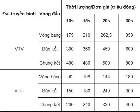 Phía Đài truyền hình Kỹ thuật số VTC sẽ áp dụng mức giá 300 triệu đồng cho suất 30 giây, các mức giá còn lại sẽ là 240 triệu (20 giây), 180 triệu (15 giây), 150 triệu (10 giây).