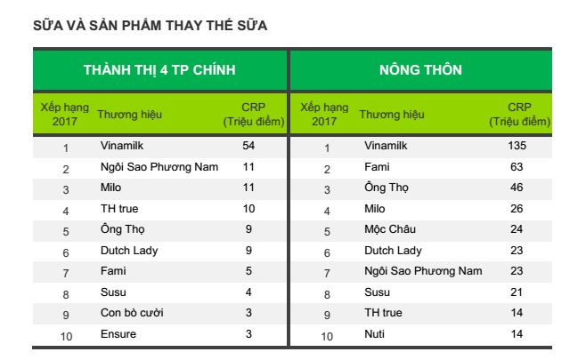Đặc biệt, trong ngành hàng sữa và các sản phẩm thay thế sữa, Vinamilk cũng là nhà sản xuất có nhiều nhãn hiệu sản phẩm được tin dùng nhất trên cả nước như Vinamilk hiện giữ vị trí số 1 và Ngôi sao Phương Nam, Ông Thọ, SuSu. Đánh giá về Vinamilk, trong báo cáo Brand Footprint về thị trường Việt Nam, Kantar Worldpanel nhận xét “Với điểm CRP khá cao, Vinamilk đang “tỏa sáng” với danh hiệu là thương hiệu Sữa được chọn mua nhiều nhất ở cả hai khu vực Thành thị 4 thành phố và Nông thôn, vượt xa các thương hiệu khác về điểm CRP.”