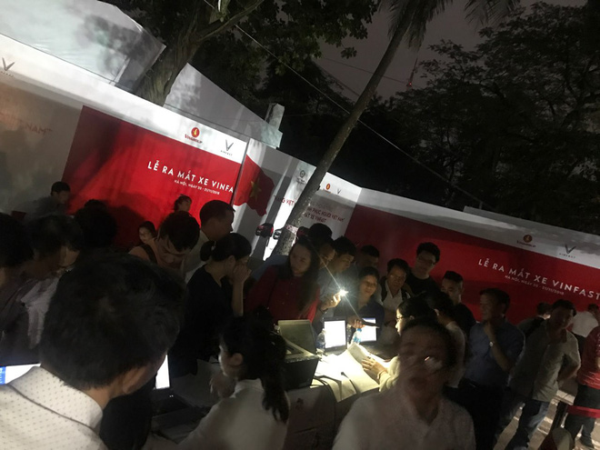 Khách xếp hàng đặt cọc xe tại quầy thu ngân "phát sinh" của VinFast đông nghẹt đến mức phải lấy đèn pin điện thoại để soi hợp đồng, với mong muốn kịp đặt những chiếc xe mang thương hiệu Việt đầu tiên. Nhiều nhân viên VinFast tiết lộ, đồng nghiệp được giao quản lý con dấu không thể ra khỏi chỗ suốt thời gian hơn 12 tiếng, vì khách đổ về làm thủ tục thanh toán không ngừng.