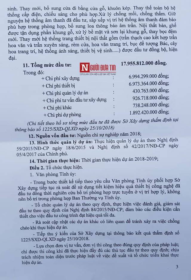 Vì thế, tổng mức đầu tư của dự án là 17,9 tỷ đồng bao gồm cả sửa chữa, xây lại một số phần cần thiết, cả mua sắm trang thiết bị, bàn ghế phục vụ cho họp, cho kết nối phòng họp. Theo định mức, cái này cũng bao gồm cả tiền dự phòng, tiền chi phí thiết kế, chi phí ban quản lý dự án theo định mức”.