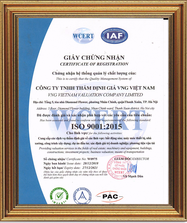 Thẩm định giá là ngành nghề đặc thù đặc biệt, đòi hỏi yêu cầu rất cao về chuyên môn và đạo đức, cũng như tính khách quan và minh bạch trong quá trình cung cấp dịch vụ. Là đơn vị hoạt động trong lĩnh vực này, VNG Value ý thức được mức độ quan trọng của việc đảm bảo chất lượng trong hoạt động kinh kinh doanh nên luôn xây dựng nhóm dịch vụ của mình đáp ứng các yêu cầu theo tiêu chuẩn ISO 9001:2015 ngay từ đầu.