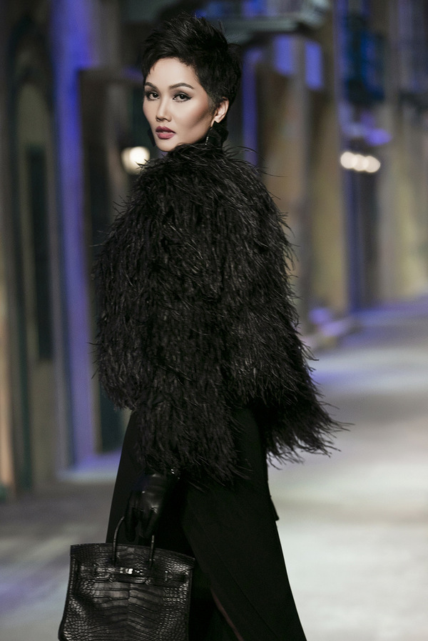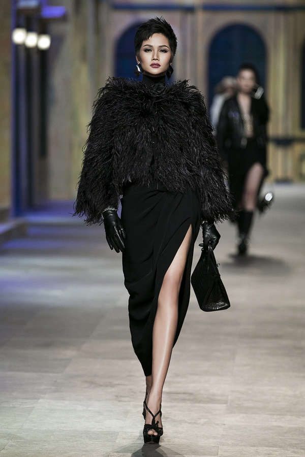 Trước đó, H'Hen Niê mở màn show diễn trong chiếc váy xẻ tà phối áo lông đen. Người đẹp thể hiện sự lạnh lùng, kiêu kỳ của một quý cô Pháp.