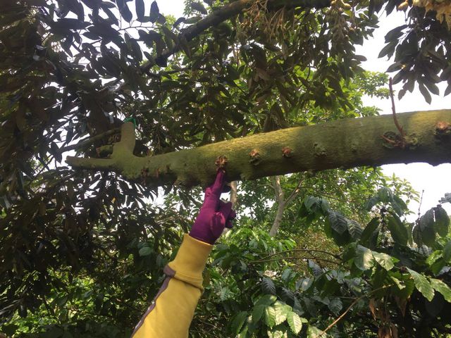 Chị Thủy cho biết, vào ngày 30/4, chị ra thăm rẫy thì tá hỏa phát hiện vườn cây sâu riêng gồm 12 cây đang cho thu hoạch và 10 cây sầu riêng (3 năm tuổi) bị chết cành, rụng hoa. Kiểm tra, chị phát hiện những gốc cây này đều bị đục nhiều lỗ trên thân, cành và phần gốc.