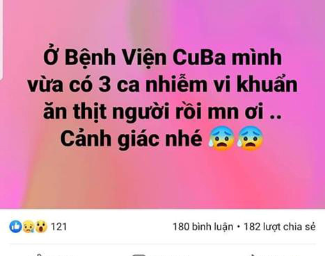 Hay một Facebook cá nhân chia sẽ: "Bệnh viện Cu Ba mình vừa có ba ca nhiểm vi khẩn ăn thịt người rồi mọi người ơi. Cảnh giác nhé". Chỉ ít phút sau khi chủ nhân của tài khoản Facebook này đăng tải, đã lập tức nhận được sự thu hút đông đảo của cộng đồng mạng với hàng trăm lượt like và chia sẻ.