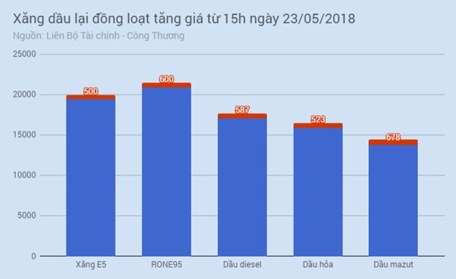 Giá xăng, dầu bán lẻ trong nước đồng loạt tăng 500-678 đồng một lít, kg tuỳ loại từ chiều 23/5, theo thông báo của liên Bộ Công Thương - Tài chính.