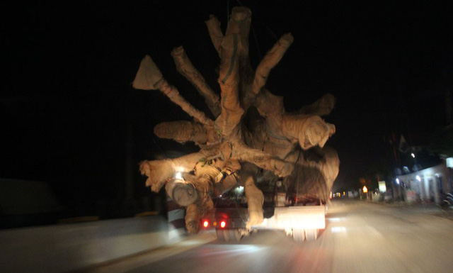 Tối ngày 26/3, nhiều người dân trên tuyến QL1A thuộc nhiều tỉnh tại Miền Trung không khỏi giật mình trước việc một chiếc xe đầu kéo (rơ móc phía sau mang BKS 73R-00338, tỉnh Quảng Bình) chở 1 cây gỗ siêu khủng trông chẳng khác nào một quái thú băng băng trên Quốc lộ 1A.