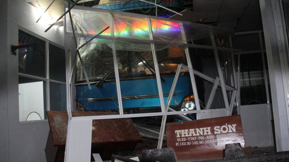 Tại hiện trường, chiếc xe tải bị hư hỏng nặng phần đầu, kín chắn gió vỡ nát, chiếc xe ô tô khách mắc kẹt nửa trong, nửa ngoài nhà chờ, nhiều vật dụng bên trong nhà chờ cũng bị hư hỏng nặng.