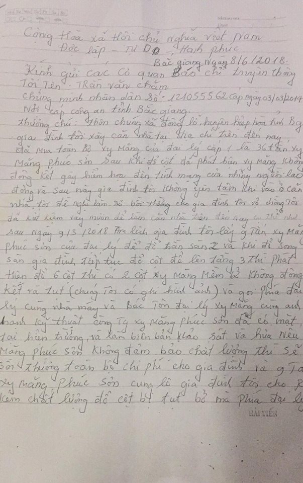 PhapluatNet nhận được đơn phản ánh của ông Trần Văn Chăm trú tại Thôn Chúng, xã Đông Lỗ, huyện Hiệp Hòa, tỉnh Bắc Giang về việc gia đình ông mua 36 tấn xi măng của Công ty cổ phần Phúc Sơn (xi măng Phúc Sơn) để phục vụ việc xây nhà. Trong quá trình đổ cột bê tông gia đình phát hiện xi măng không đông kết và rơi vãi khi tháo cốt pha.