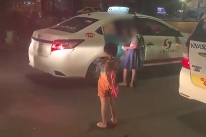 Đoạn clip ghi lại cảnh một bé ôm ghì chân ngăn cản vị khách lên taxi, bé còn lại dùng chân đá nhóm du khách với vẻ bực bội.