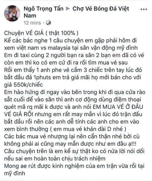 Anh Ngô Trọng Tấn (Hà Nội) vẫn mua phải 1 cặp vé giả. Tưởng như chỉ những trận đấu có độ hấp dẫn cao như trận bán kết lượt về thì mới xảy ra tình trạng vé giả nhưng theo anh Tấn thì tình trạng này đã diễn ra từ các lượt trận trước.