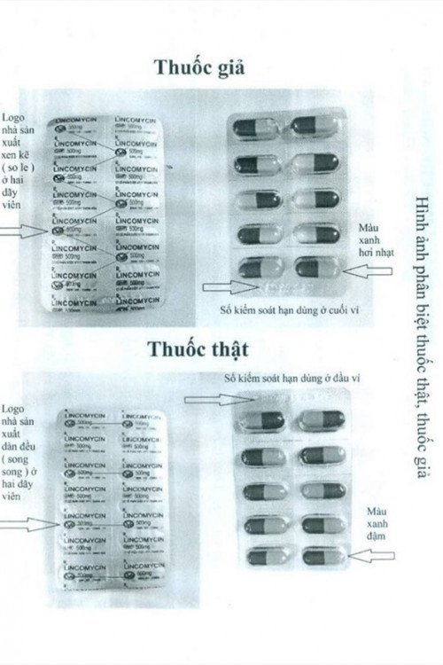 Chính vì vậy, để đảm bảo an toàn an toàn cho người sử dụng, Cục Quản lý Dược ban hành Công văn số 22214/QLD-CL ngày 26/12/2017 gửi Sở Y tế các tỉnh, thành phố trực thuộc Trung ương, để thông bá, nhận biết đặc điểm của thuốc giả Lincomycin 500mg, SĐK: VN- 13960-11. Số lô: 175. HD: 06/02/2019, trên nhãn ghi mạo danh cơ sở sản xuất là Công ty Cổ phần dược vật tư y tế Thanh Hoá.