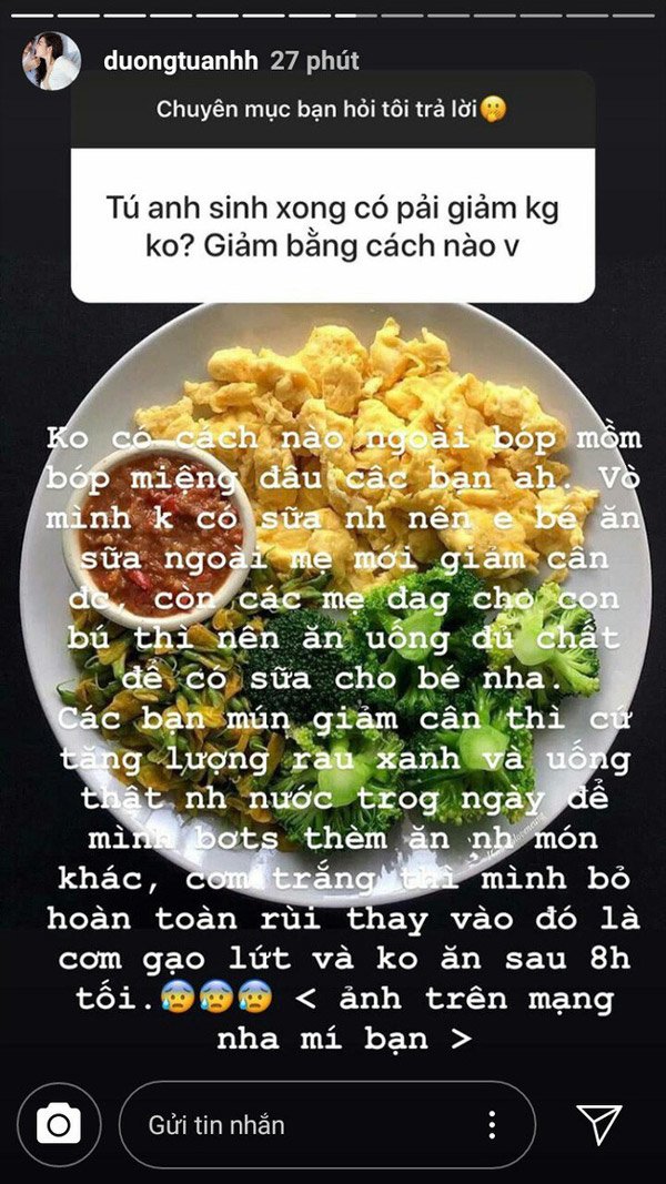 Để lấy lại được vóc dáng thon gọn, thanh mảnh của mình, Tú Anh đã có chế độ ăn uống và tập luyện khoa học. Cô tăng lượng rau xanh và uống thật nhiều nước trong ngày để bớt thèm ăn những món khác. Tú Anh bỏ cơm trắng hoàn toàn, thay vào đó là gạo lứt và không ăn sau 8 giờ tối.